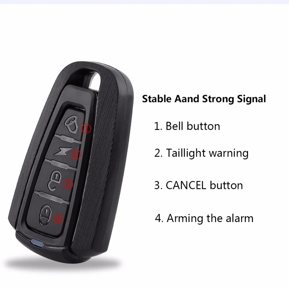 Lock: Press the remote control Lock key,Taillight will ring three times Bi Bi Bi to alert owner,Taillight has entered the armed state,you will hear a ringing sound BI after 3 seconds, After 2 seconds the touch will go into alarm.