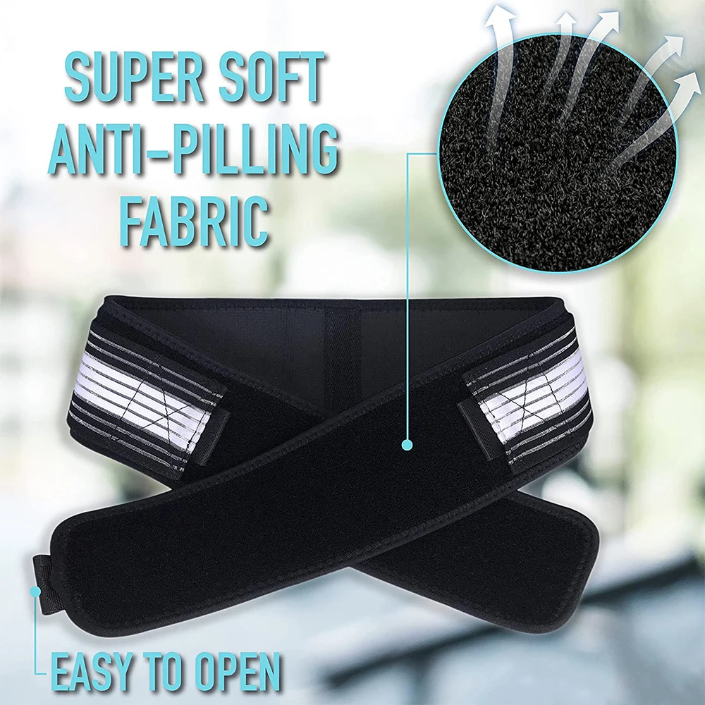 The smart design of this belt allows you to adjust the tightness, compression and support to your preference. Simply adjust the two elastic tension straps and get a tighter or looser fit. The strong hook & loop closures are equipped with ‘smart tabs’ that make it super easy to unstick the straps.