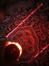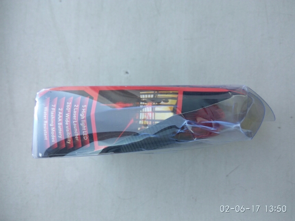 Received after 25 days of order. cool flashlight. come without batteries, need two mizinchikovye. the large trailer, the child is happy. A few red light bulbs with different modes of light and two laser stripes (included a separate button).