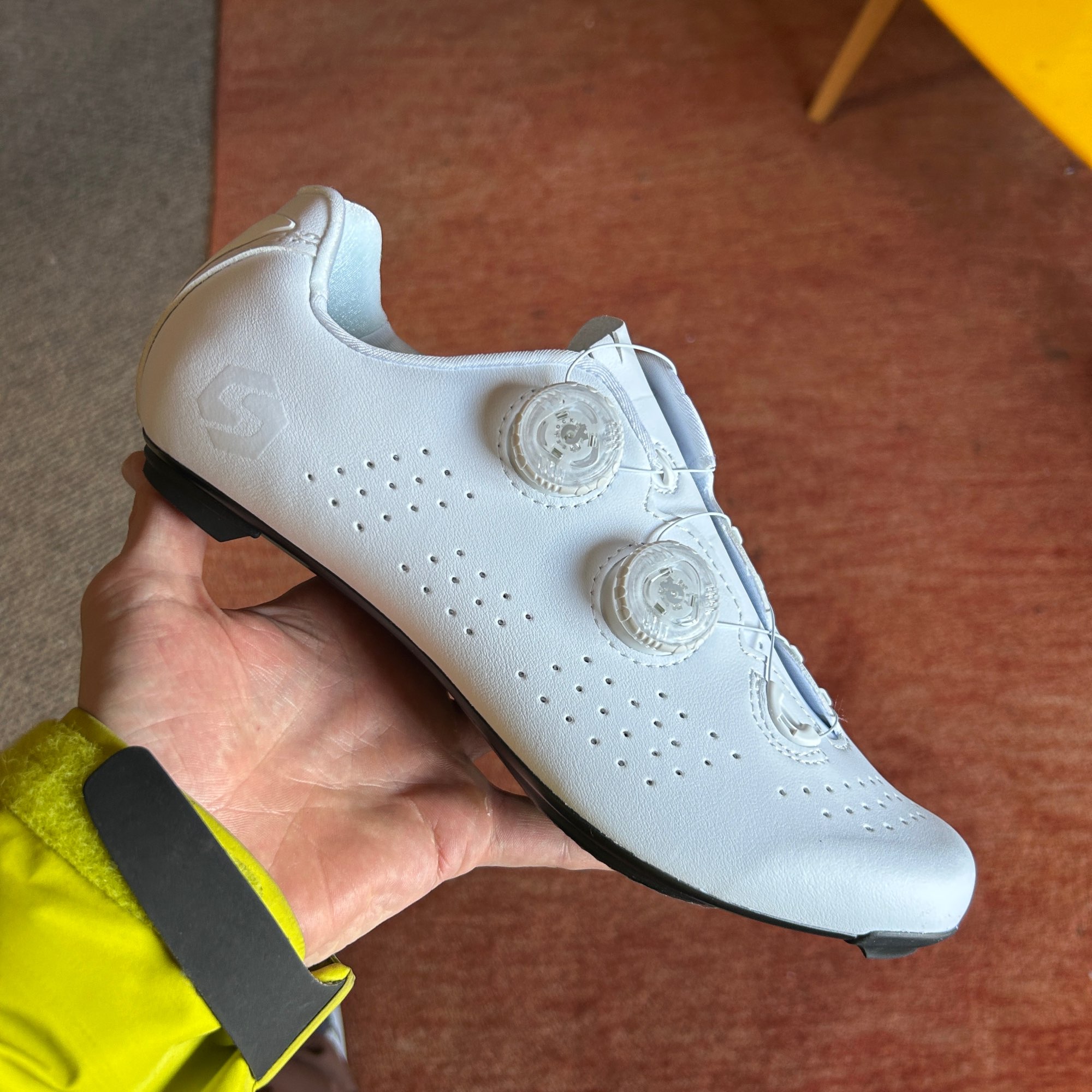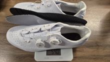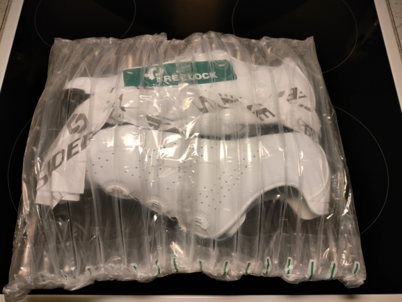 fast shipping. Brilliant white, whiteer than most socks. Passform quite narrow. Processing is amazingly good. Stitching at level of easton ec90 slx. Head content very good, Boa similar clasp. Weight in 44 at 540g including sole.