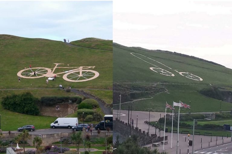 A giant bicycle designed to celebrate the Tour of Britain has been transformed into an even more disproportionately sized hillside penis, after tricksters tampered with the design. The structure, adorning Capstone Hill in Devon and made from cardboard and reclaimed plastic, was altered overnight and revealed amid the glory of...