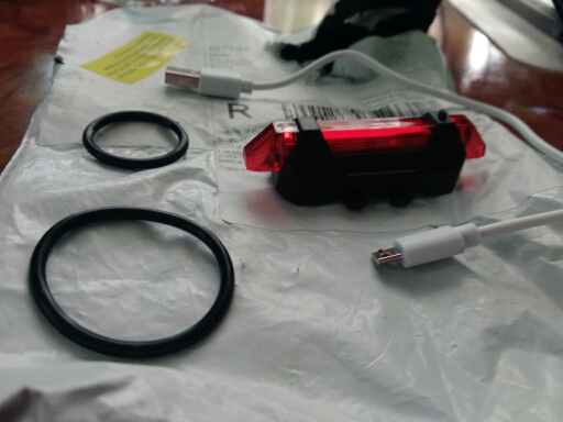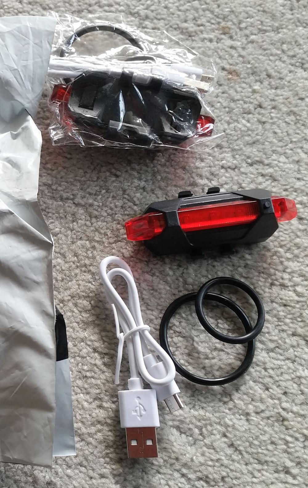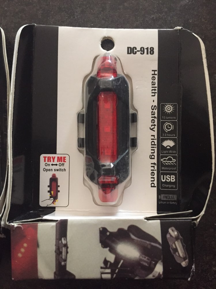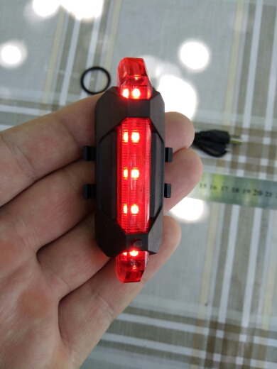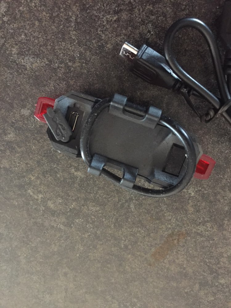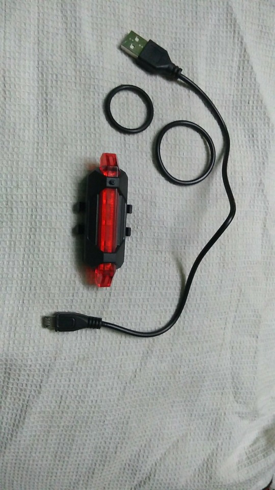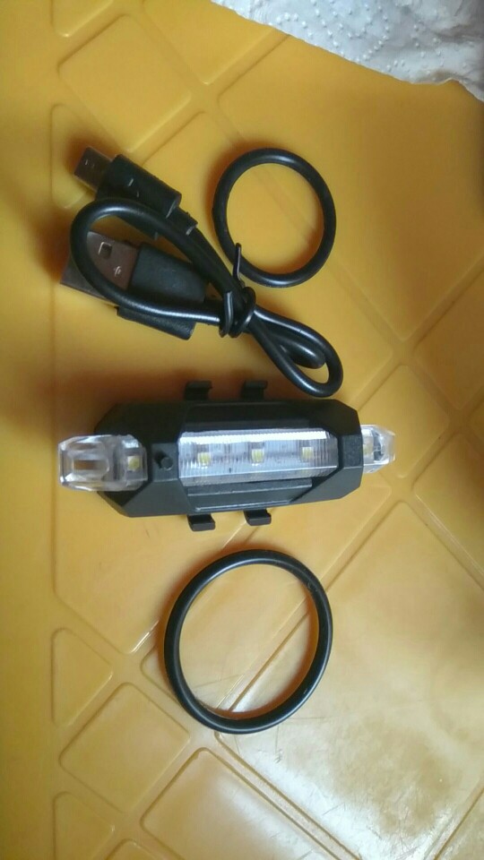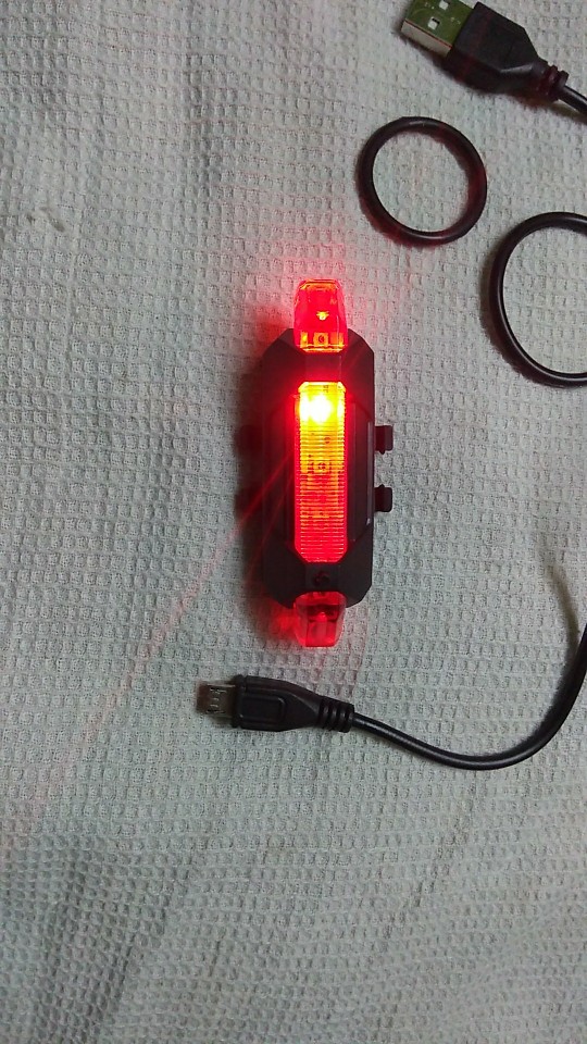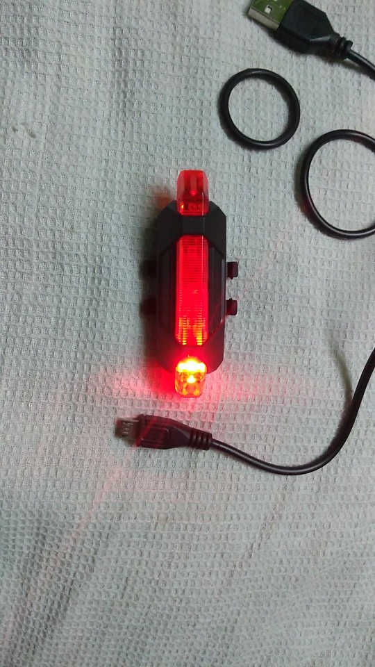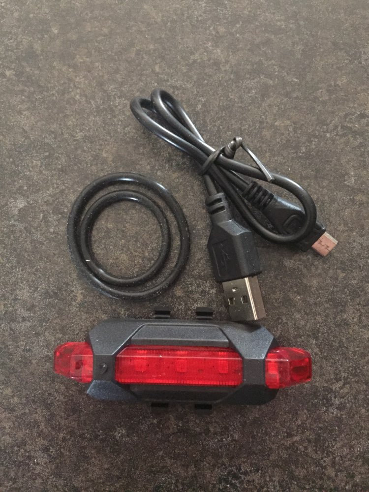 Good little bike light. USB rechargeable, cable included. Different flashing modes.
